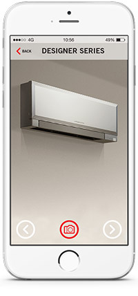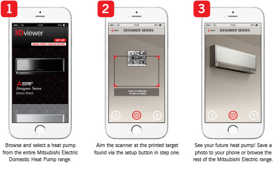The 3Dviewer app works with the power of augmented reality. 3Dviewer uses your smartphones’ camera, accelerometer, and compass to create a live 3D preview of any heat pump from the Mitsubishi Electric Domestic High Wall and Floor Console range. It’s the perfect tool for planning the placement, type, and colour of your future heat pump.