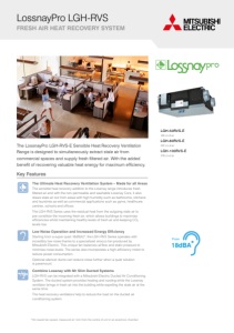 LossnayPro LGH-RVS FRESH AIR HEAT RECOVERY SYSTEM The LossnayPro LGH-RVS-E Sensible Heat Recovery Ventilation Range is designed to simultaneously extract stale air from commercial spaces and supply fresh filtered air. With the added benefit of recovering valuable heat energy for maximum efficiency. Key Features The Ultimate Heat Recovery Ventilation System – Made for all Areas The sensible heat recovery addition to the Lossnay range introduces fresh filtered air and with the non-permeable and washable Lossnay Core, it also draws stale air out from areas with high humidity such as bathrooms, kitchens and laundries as well as commercial applications such as gyms, healthcare centres, schools and offices. The LGH-RVS Series uses the residual heat from the outgoing stale air to pre-condition the incoming fresh air, which allows buildings to maximise efficiencies whilst maintaining healthy levels of fresh air and keeping CO2 levels low. Low Noise Operation and Increased Energy Efficiency Starting from a super quiet 18dB(A)*, the LGH-RVS Series operates with incredibly low noise thanks to a specialised sirocco fan produced by Mitsubishi Electric. This unique fan balances airflow and static pressure to minimise noise levels. The series also incorporates a high-efficiency motor to reduce power consumption. Optional silencer ducts can reduce noise further when a quiet solution is paramount. Combine Lossnay with Mr Slim Ducted Systems LGH-RVS can be integrated with a Mitsubishi Electric Ducted Air Conditioning System. The ducted system provides heating and cooling while the Lossnay ventilator brings in fresh air into the building while expelling the stale air at the same time. The heat recovery ventilators help to reduce the load on the ducted air conditioning system. LGH-50RVS-E 139 L/s of air LGH-80RVS-E 222 L/s of air LGH-100RVS-E 278 L/s of air *On lowest fan speed, measured at 1.5m from the centre of unit in an anechoic chamber. 18dBA From *