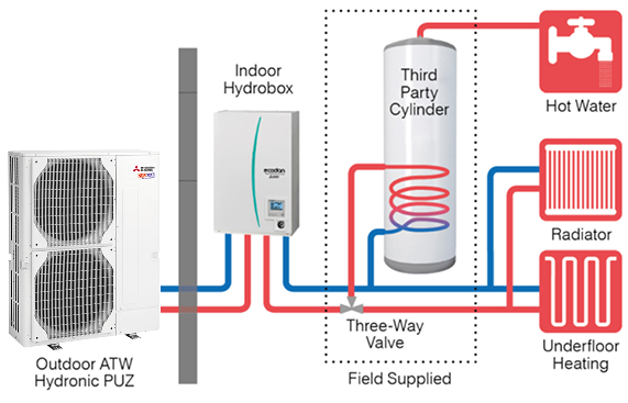 The split hydrobox system for larger homes connecting to underfloor, radiators and fan coils. You can also combine a large coil cylinder for domestic hot water via a three-way valve. They are a highly adaptable solution for retrofit and new builds and light commercial projects.